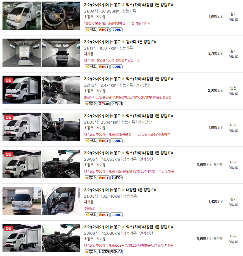 본 포스팅에서 설명한 2025 봉고3 전기차, 중고차 가격, 연식별 시세, 차량 유지비 정보를 통해 중고차 구매를 고려하실 때 많은 도움이 되시길 바랍니다.
