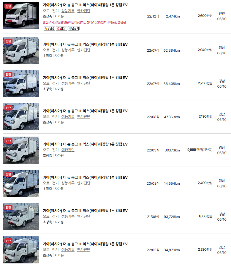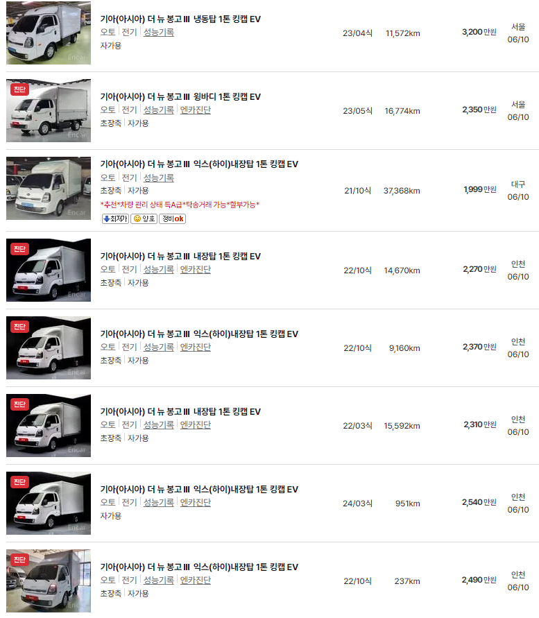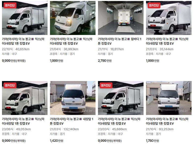 봉고3 전기차 중고차 가격 시세표 | 1톤 전기트럭 중고가격