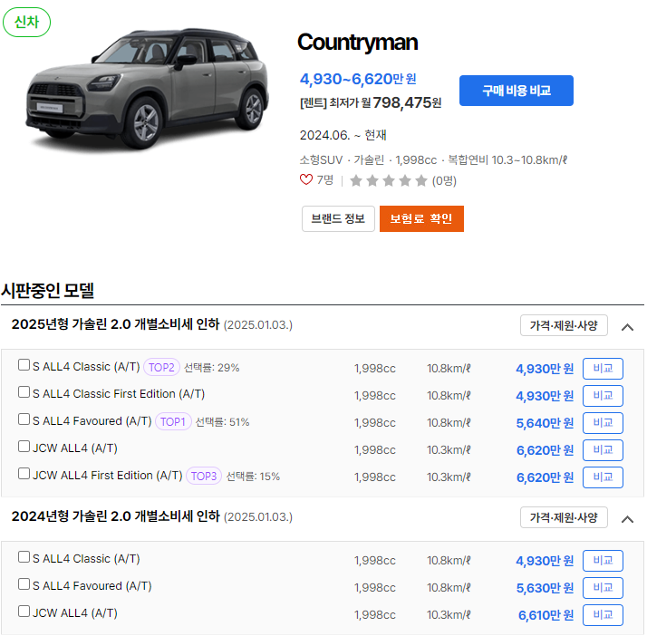 마무리하자면, 2025 미니쿠퍼 컨트리맨은 다양한 가격, 연비, 제원, 유지비 면에서 매력적인 선택지를 제공합니다. 해당 차량 구매에 고민 중이시라면 위 정보를 참고해보시길 바랍니다.