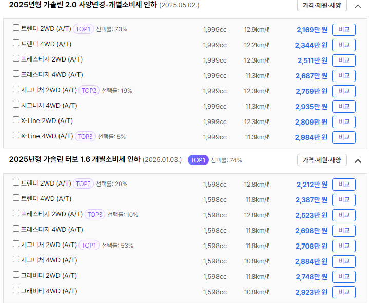 인기 차종은 프레스티지 2WD 모델로, 가격과 연비에서 좋은 비율을 제공합니다.