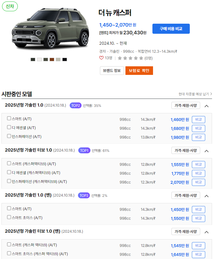 2025 캐스퍼는 가솔린 터보 모델이 특히 인기가 높습니다.