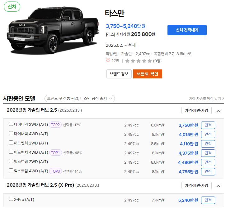2026 타스만의 가격은 트림별로 3,750만 원에서 5,240만 원 사이입니다.