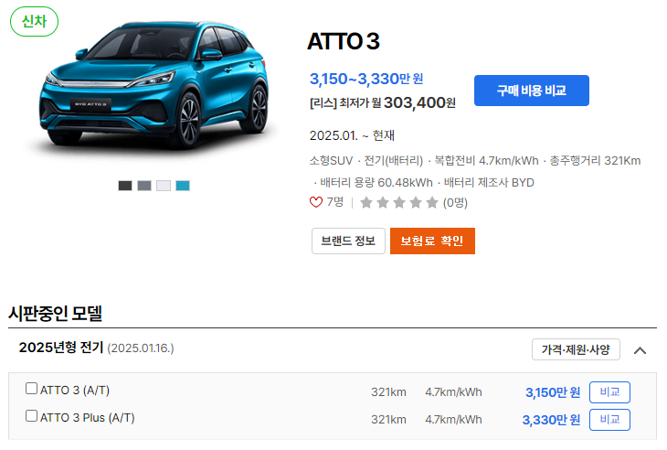 BYD 아토3의 가격, 연비, 제원, 유지비 등 다양한 정보를 제공하였습니다. 해당 차량 구매에 고민 중이시라면 위 정보를 참고해보시길 바랍니다.