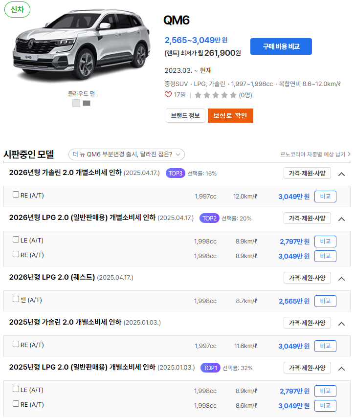2026 QM6 LPG SUV는 다양한 트림으로 제공되어 각 트림에 따른 가격 선택이 가능합니다.